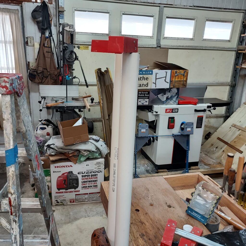 In this case, you take a 10’ section of 1-1/2” plastic pipe and a couple of plastic pipe caps. You cut them in half (using a handsaw with my left arm was fun) and glue the caps on the bottom (using plastic pipe cleaner and then glue). Once it has dried, its on to cleanup.