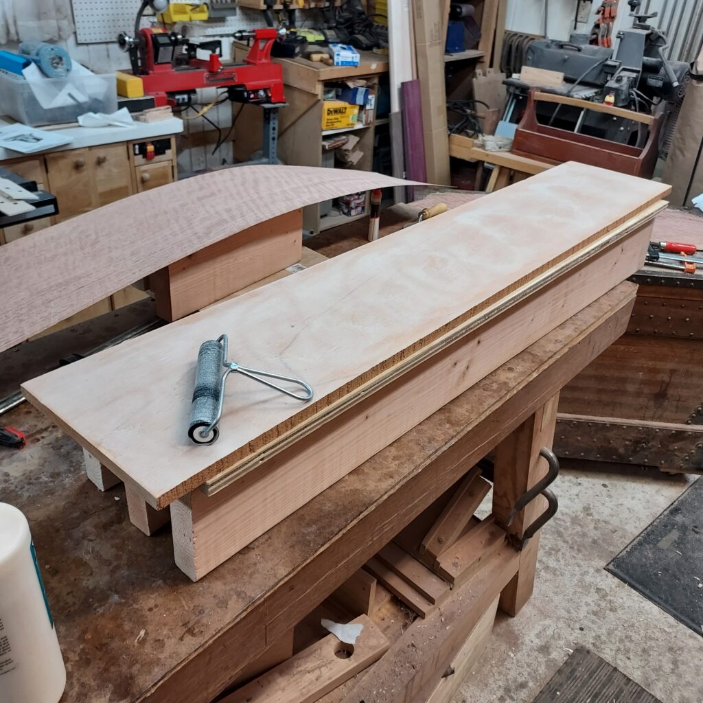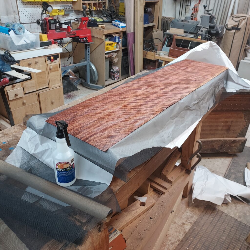 I inspected the veneer as it came to me (it was rolled up) and determined that I needed to flatten it in order for it to adhere to the substrate. I sprayed on a “softener” and build then sandwiched it. I put a plywood “platen” 10” x 48” down, then some paper, then fiberglass (not metal) screen, then the sprayed down veneer, then more screen, more paper, and then another section of plywood. I let it sit overnight, and it came out nice a flat. On to the veneering!