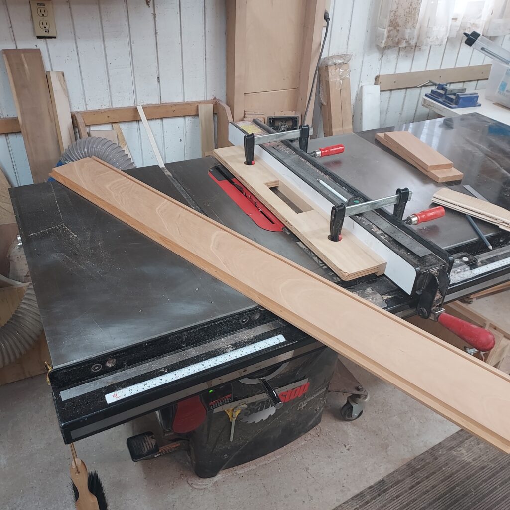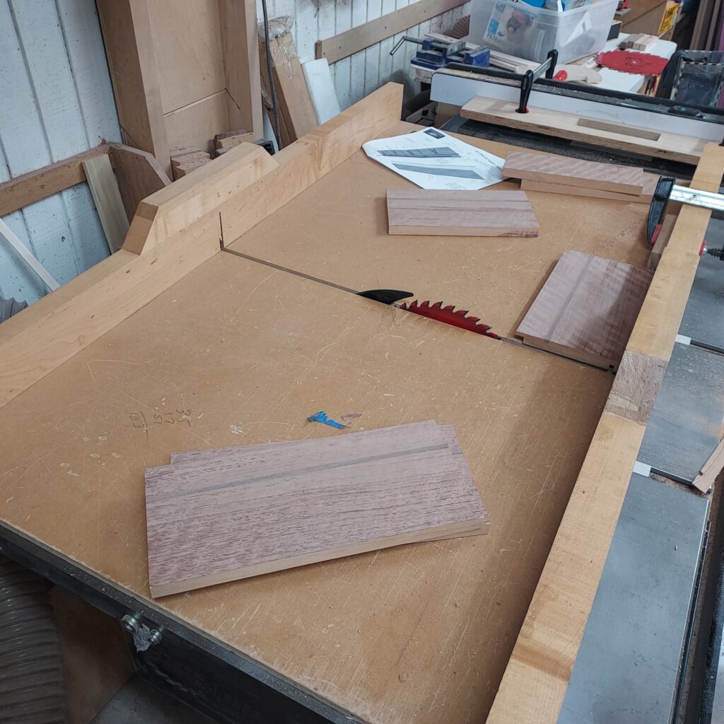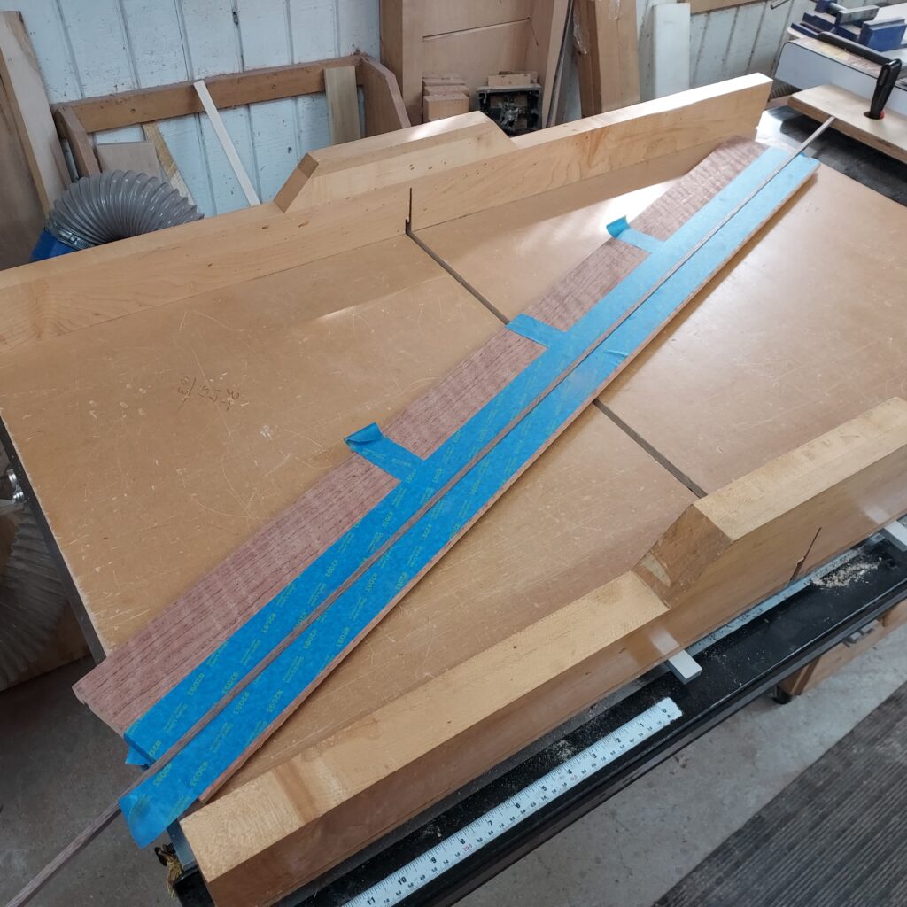 After that, I cut ¼” walnut trim for the groove. After test fitting, I lined each side with tape to keep any glue squeeze out off, then glued them in. I kept the walnut a little “proud” of the groove to ensure it was all the way in.