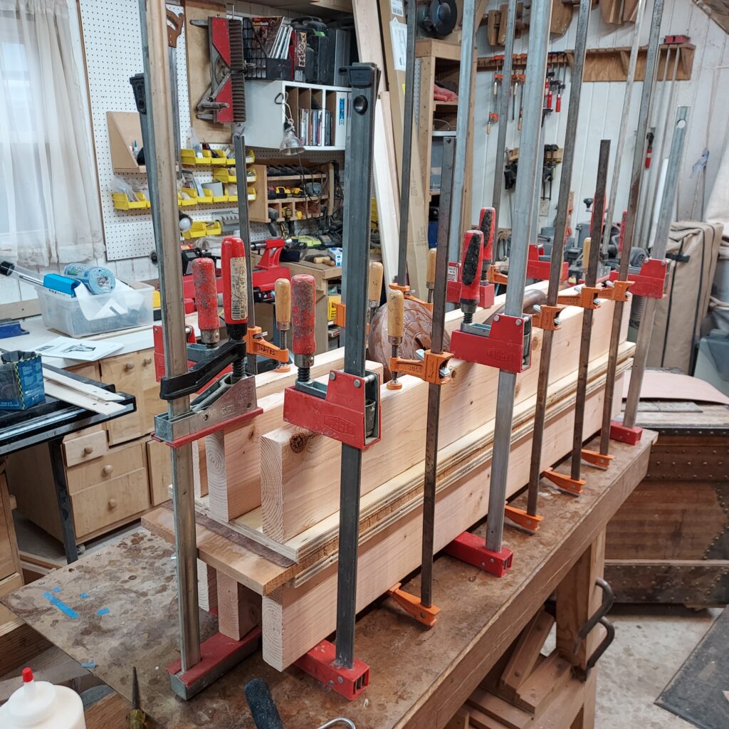 After that, I put on a second plywood platen, this one covered in cork and then packing tape. The cork allows some “cushion” at the veneer adheres. From there its on to a lot of clamps, and let it sit overnight.