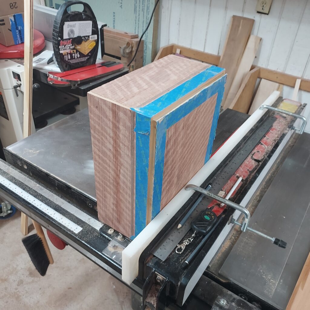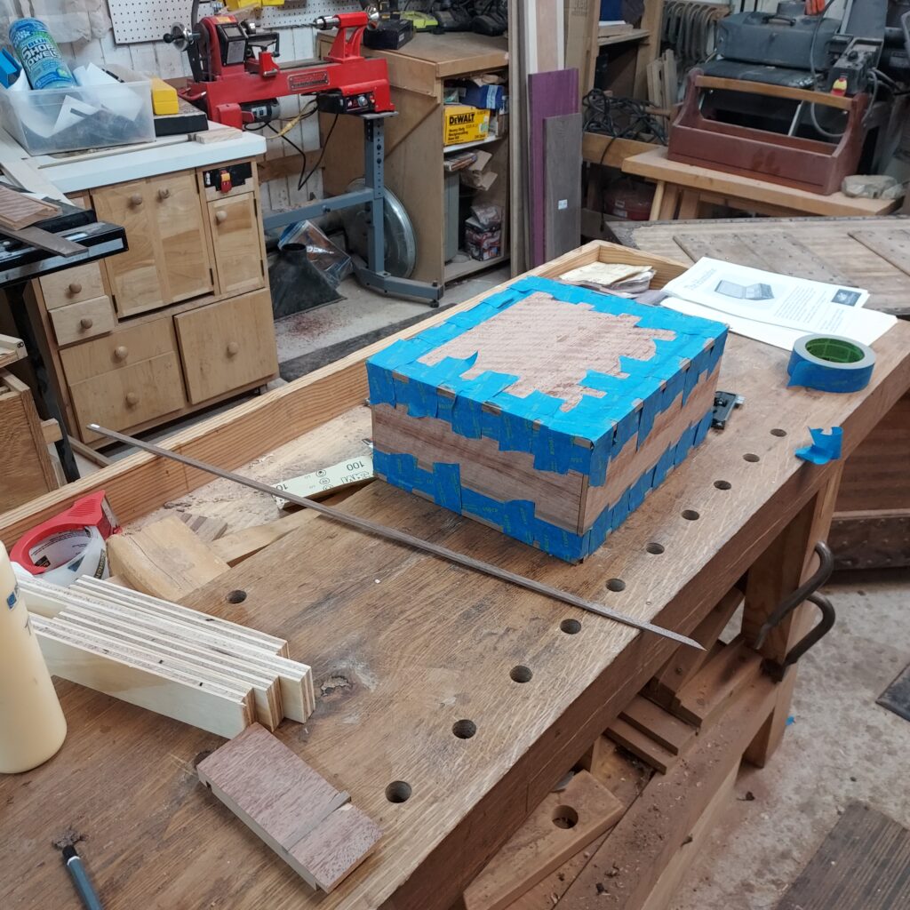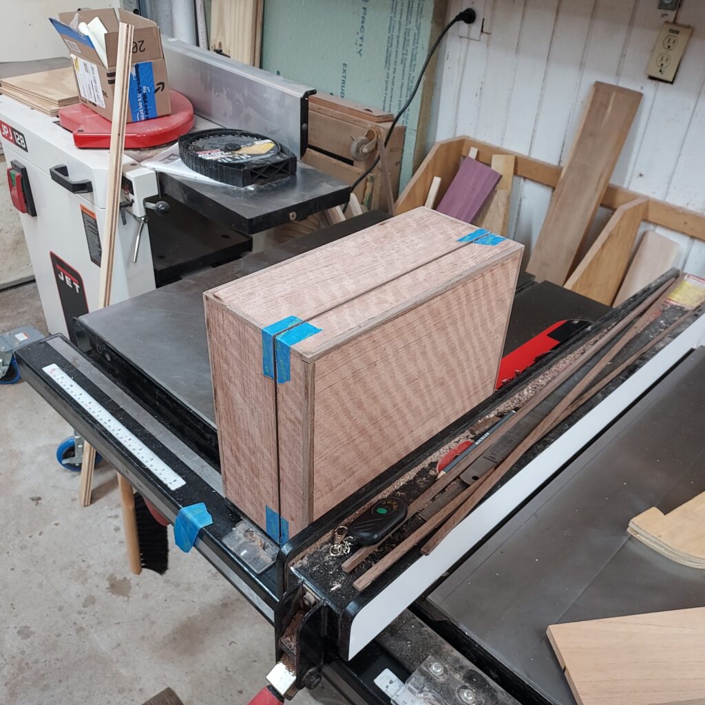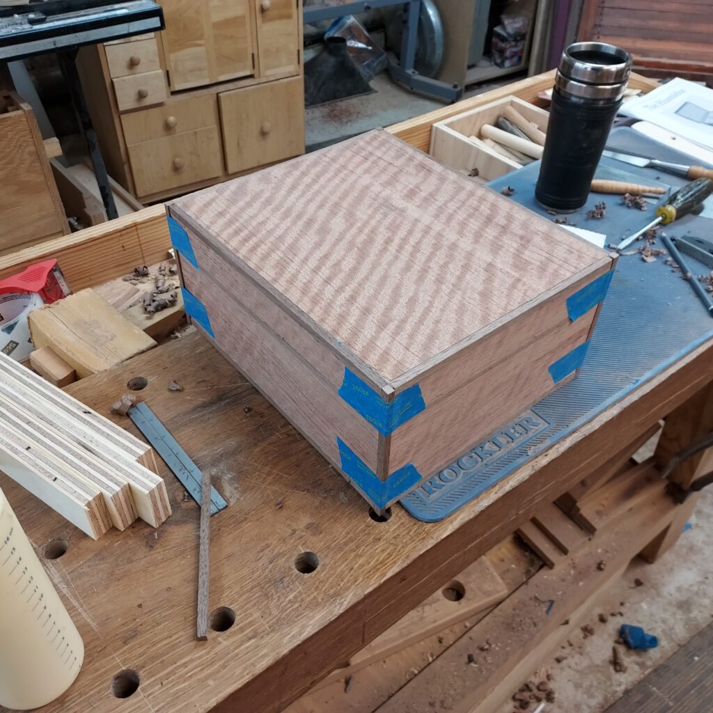 On t the trim. I covered the edges with blue tape, and cut ¼” x ¼” rabbets in the top & bottom. After cutting the Walnut strips to size, I again used the blue tape to “clamp” the pieces in place after glueing. I also cut rabbets on the sides after this, and put in Walnut trim there as well. With that done, I had a complete box, though it die not have any opening in it.