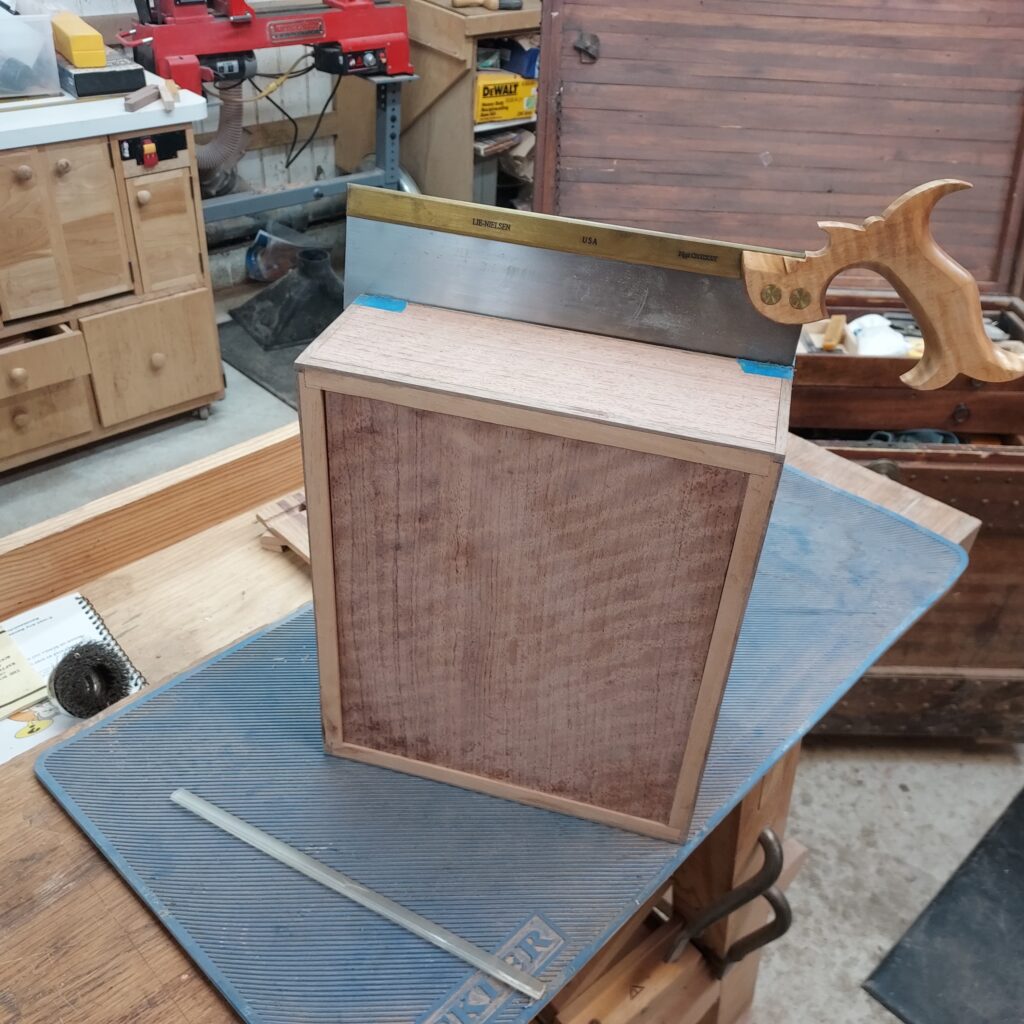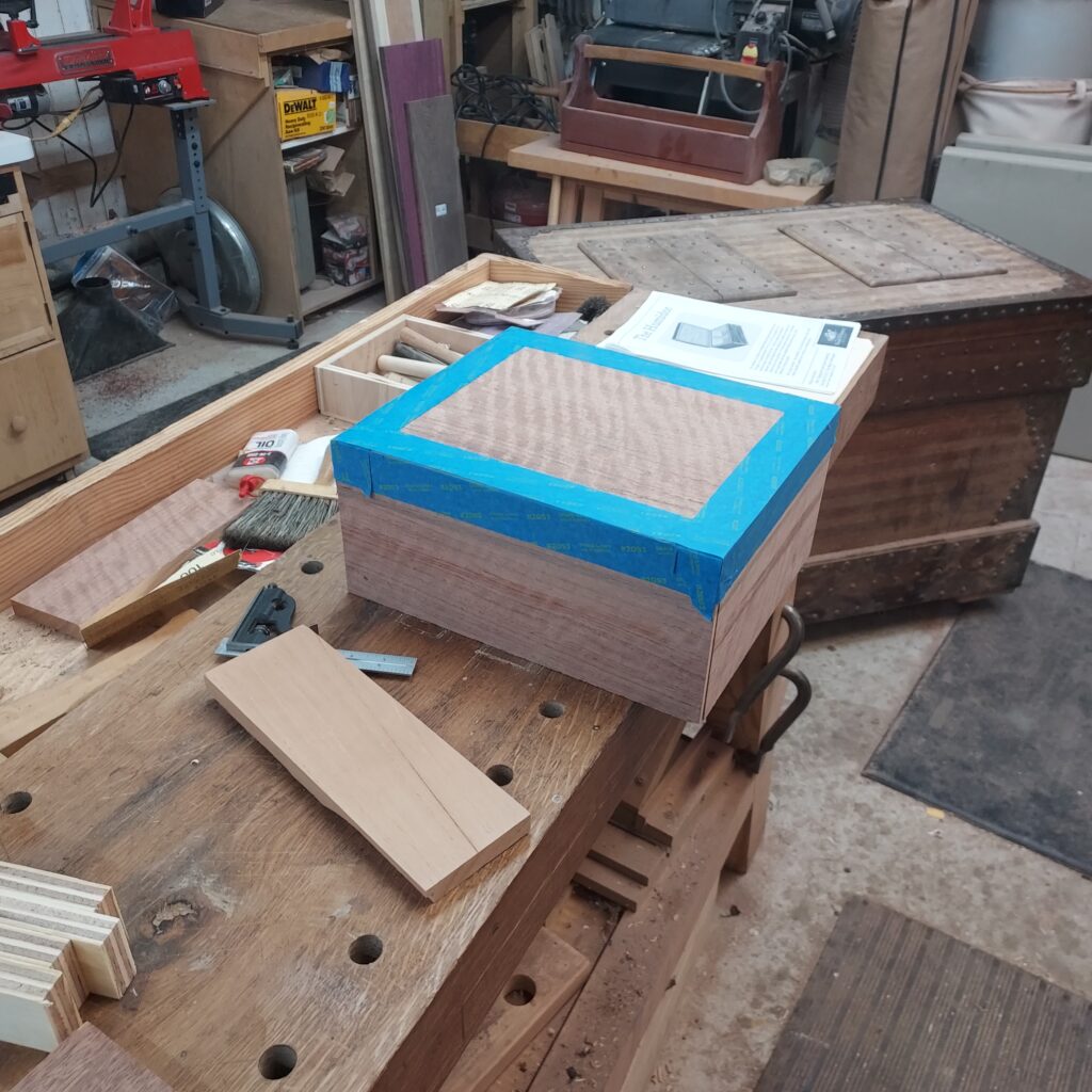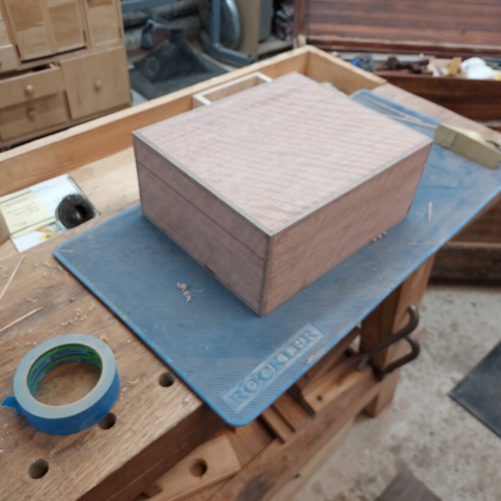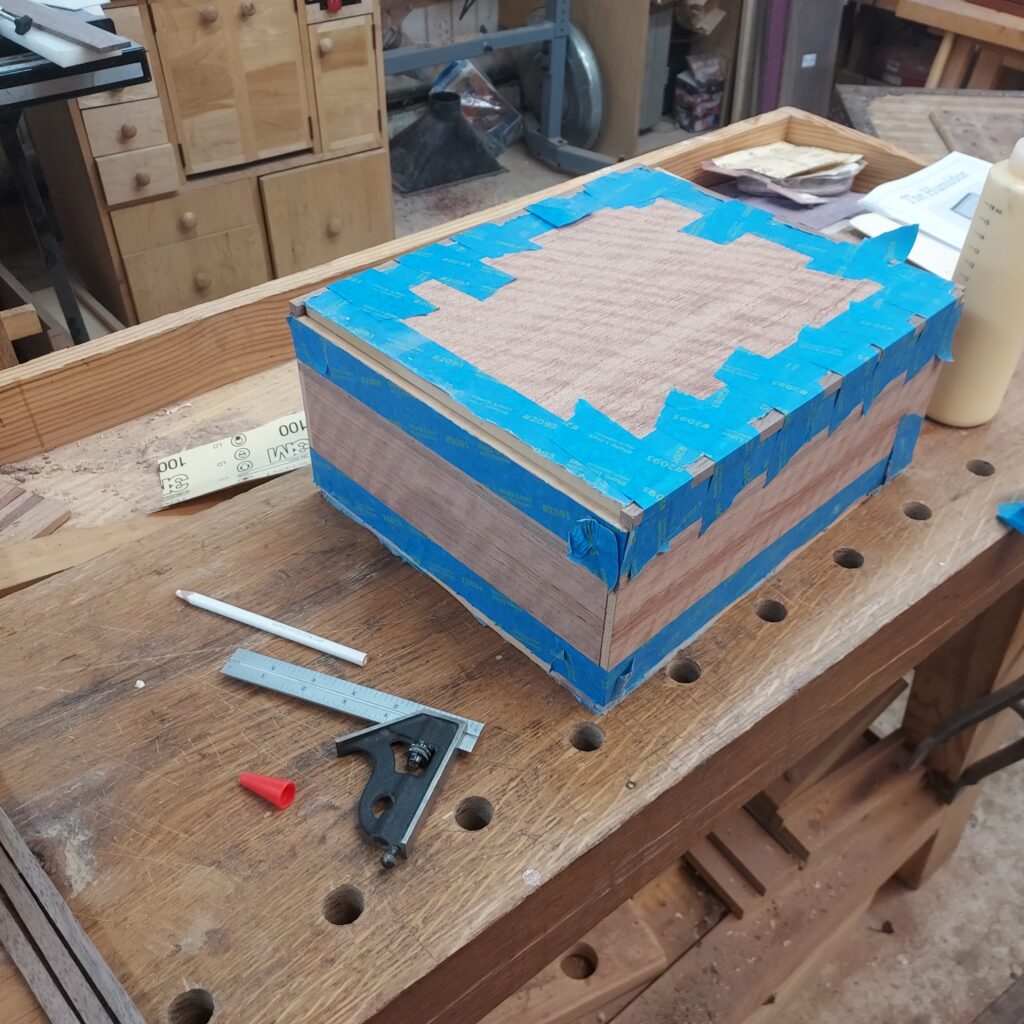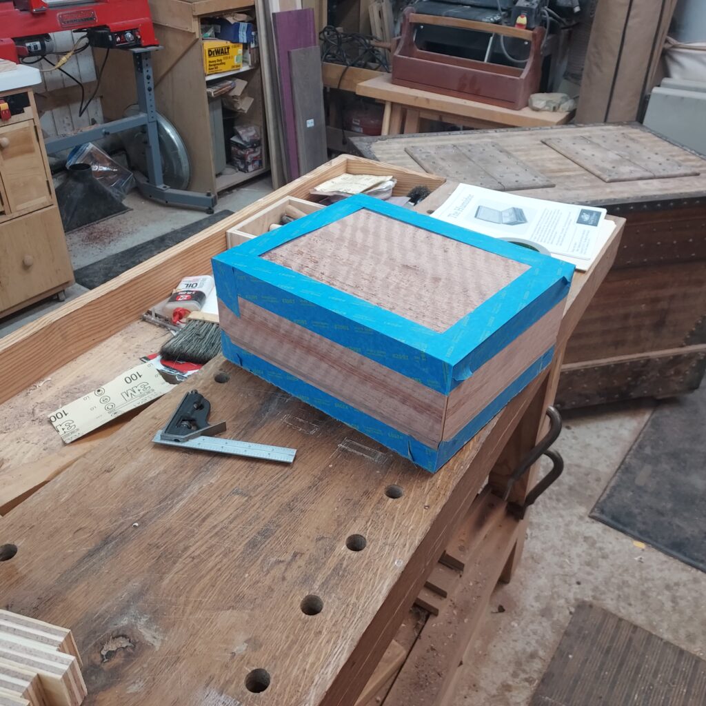 On t the trim. I covered the edges with blue tape, and cut ¼” x ¼” rabbets in the top & bottom. After cutting the Walnut strips to size, I again used the blue tape to “clamp” the pieces in place after glueing. I also cut rabbets on the sides after this, and put in Walnut trim there as well. With that done, I had a complete box, though it die not have any opening in it.
