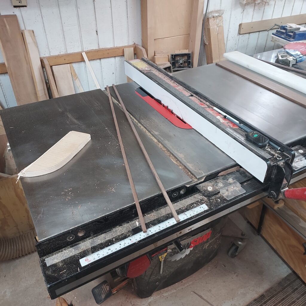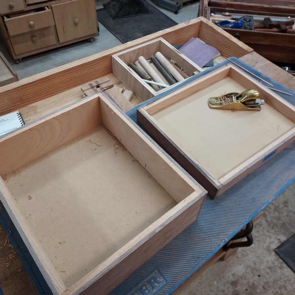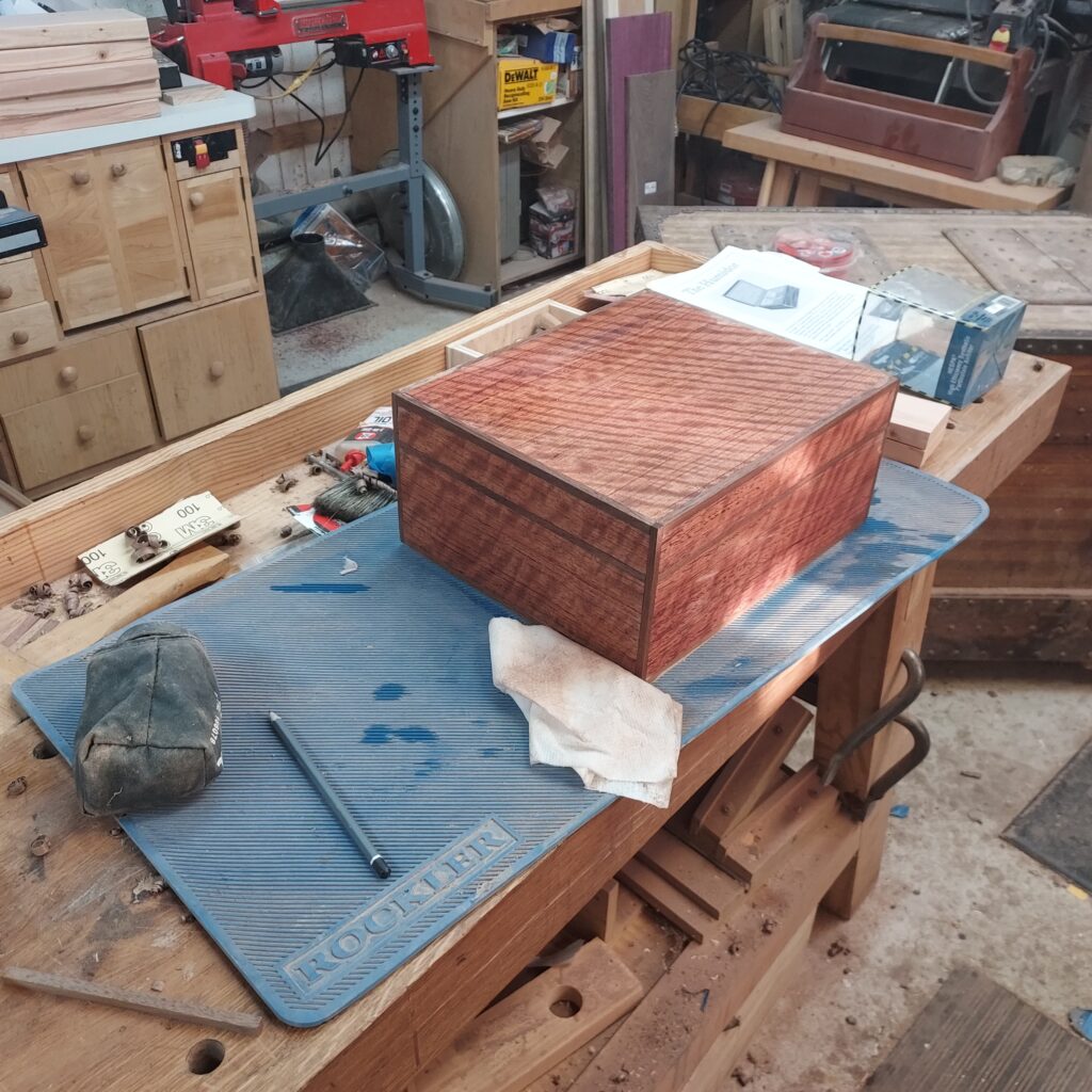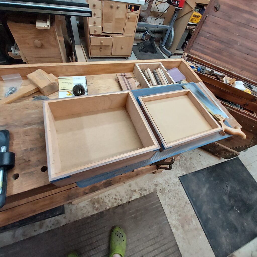 On t the trim. I covered the edges with blue tape, and cut ¼” x ¼” rabbets in the top & bottom. After cutting the Walnut strips to size, I again used the blue tape to “clamp” the pieces in place after glueing. I also cut rabbets on the sides after this, and put in Walnut trim there as well. With that done, I had a complete box, though it die not have any opening in it.