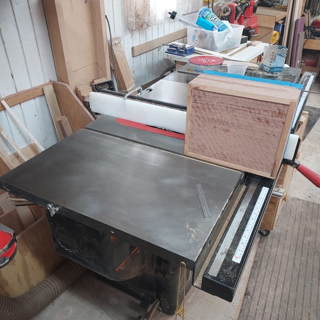 I used a dado blade to cut dados in the front and back pieces, as well as a dado for the top and a groove for the bottom. With that done, I glued up the sides and bottom. . The sides will sit in the dados, and after that dried, I glued in the top.
